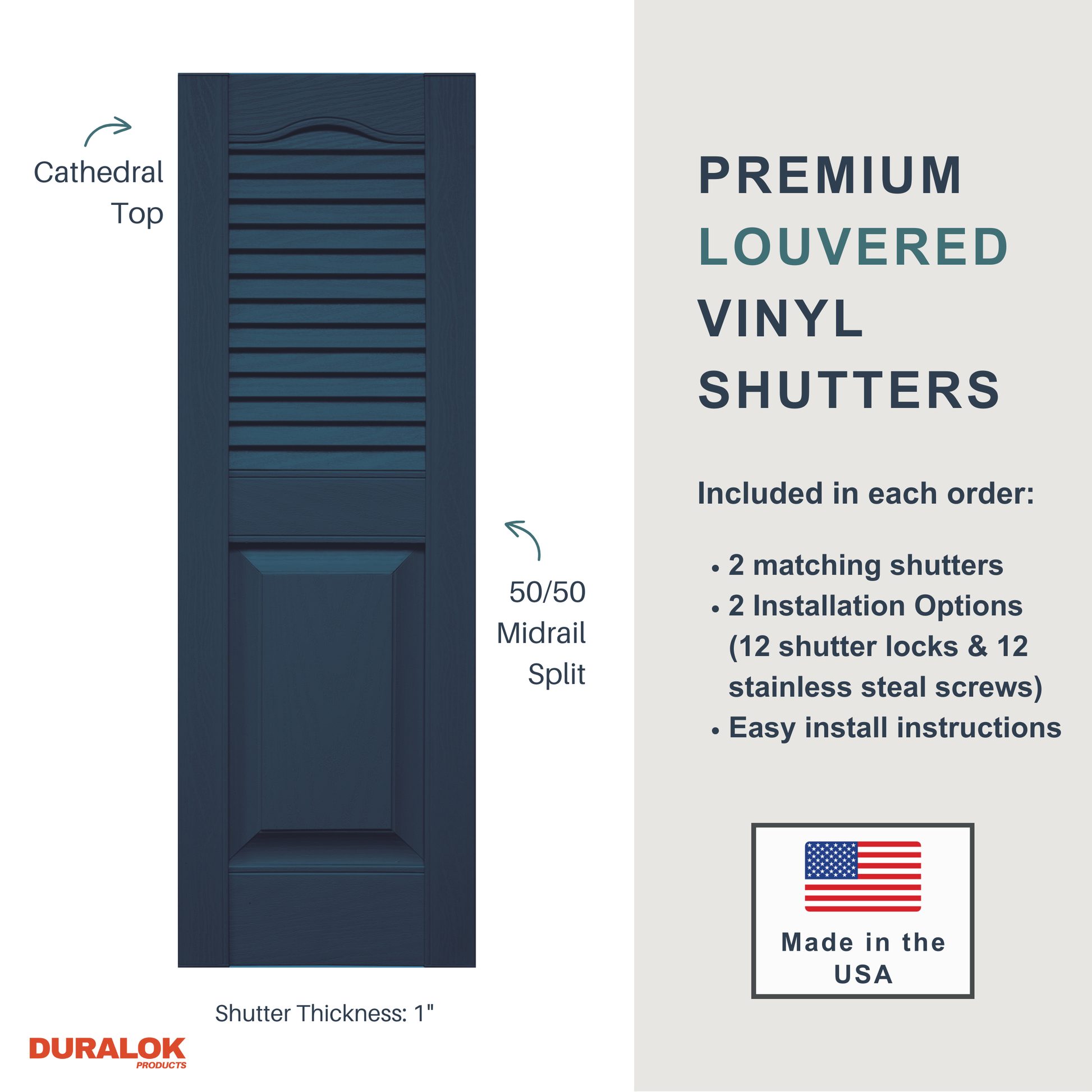 Crafted with precision, these non-functional louvered vinyl shutters over raised panel boast crisp angles and sleek lines, crowned by a cathedral top, exuding both vertical and horizontal appeal. Their classic and clean design complements various architectural styles, making them a perfect fit for colonial, historical, and ranch-style homes.