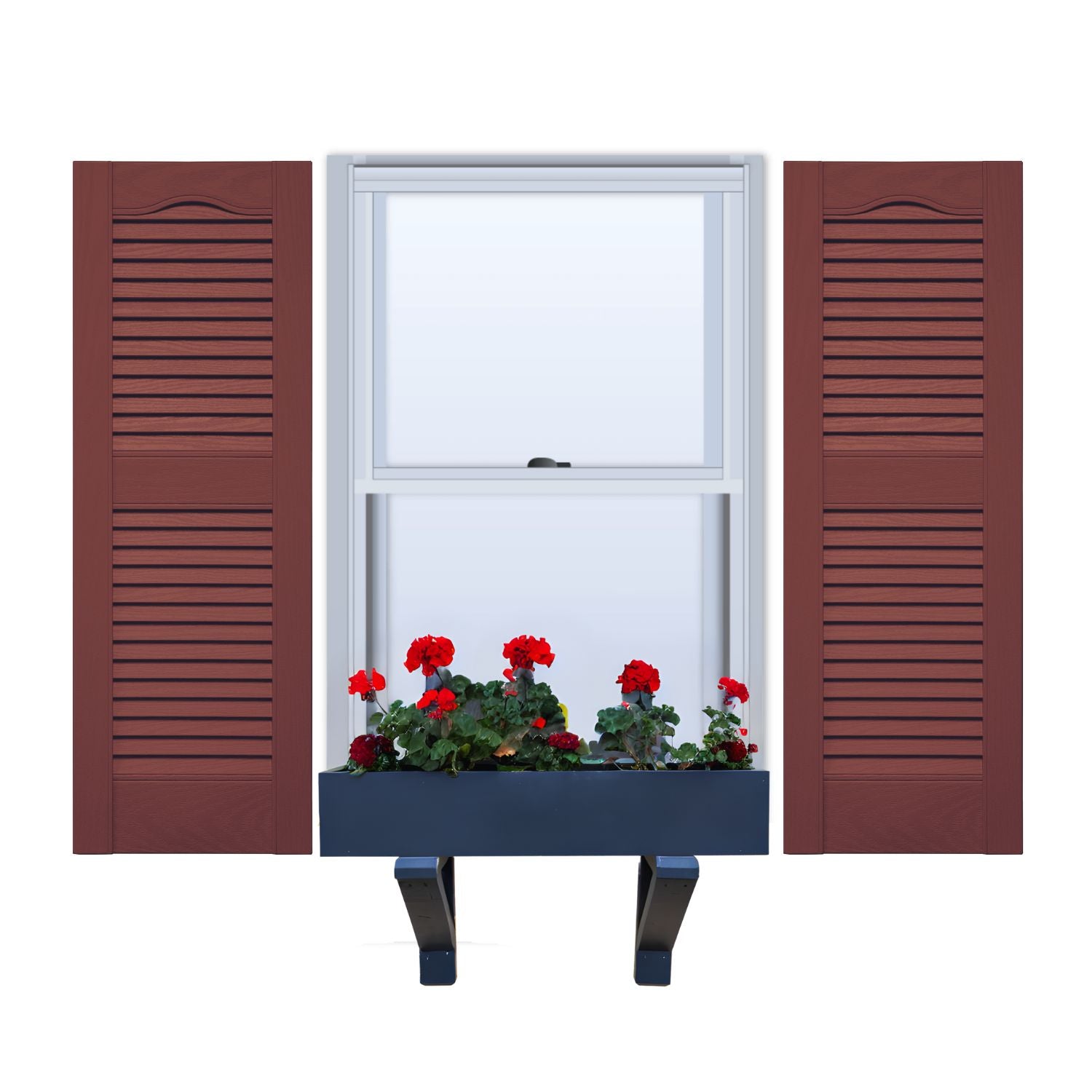 Crafted with precision, these non-functional louvered vinyl shutters over raised panel boast crisp angles and sleek lines, crowned by a cathedral top, exuding both vertical and horizontal appeal. Their classic and clean design complements various architectural styles, making them a perfect fit for colonial, historical, and ranch-style homes.